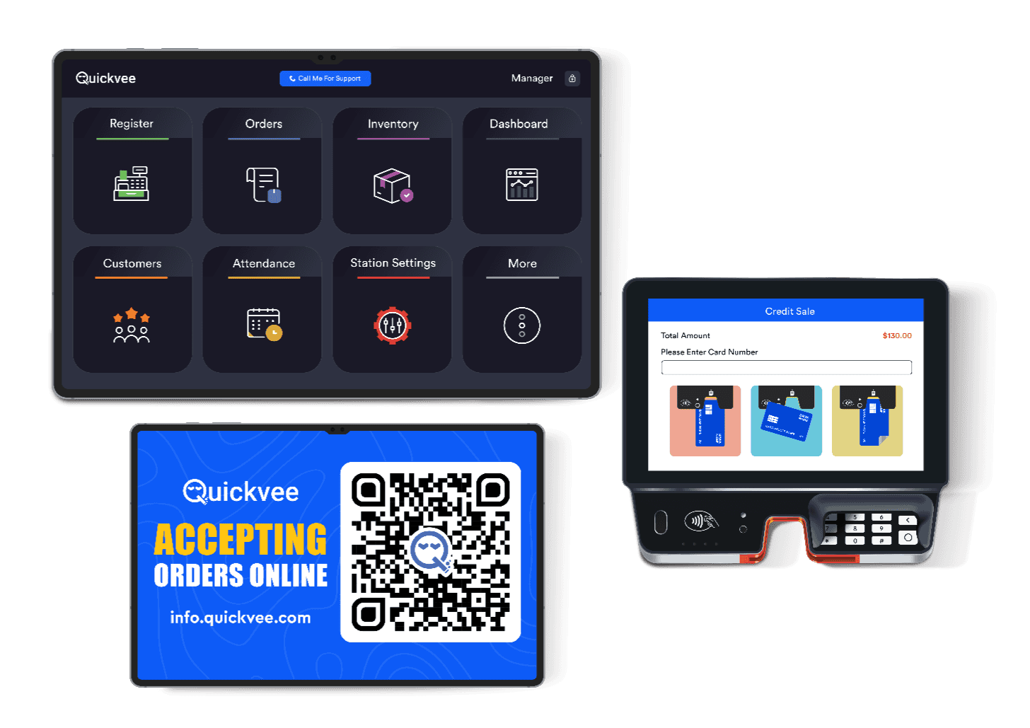 Quickvee POS supports a variety of hardware, including barcode scanners, receipt printers, cash drawers, and tablets. Check our hardware store for compatible options.