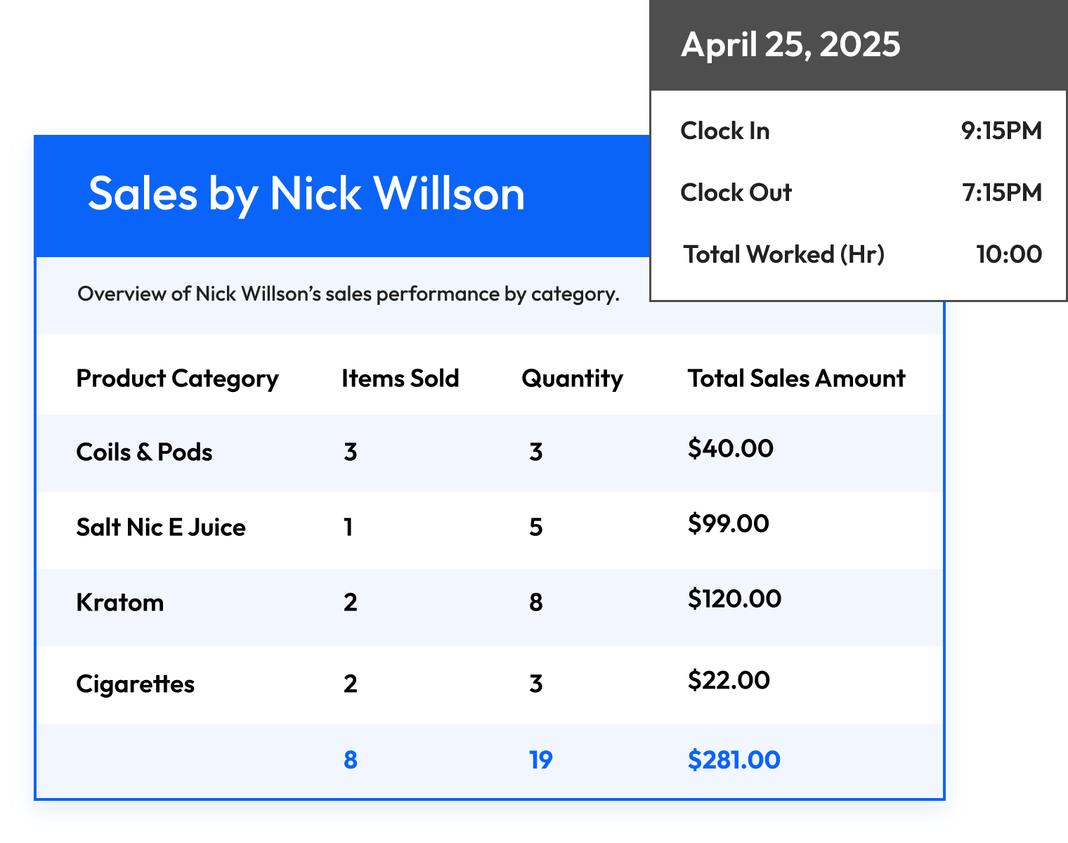 Hourly breakdown of revenue, COGS, margin, and tax. Great for staffing decisions.