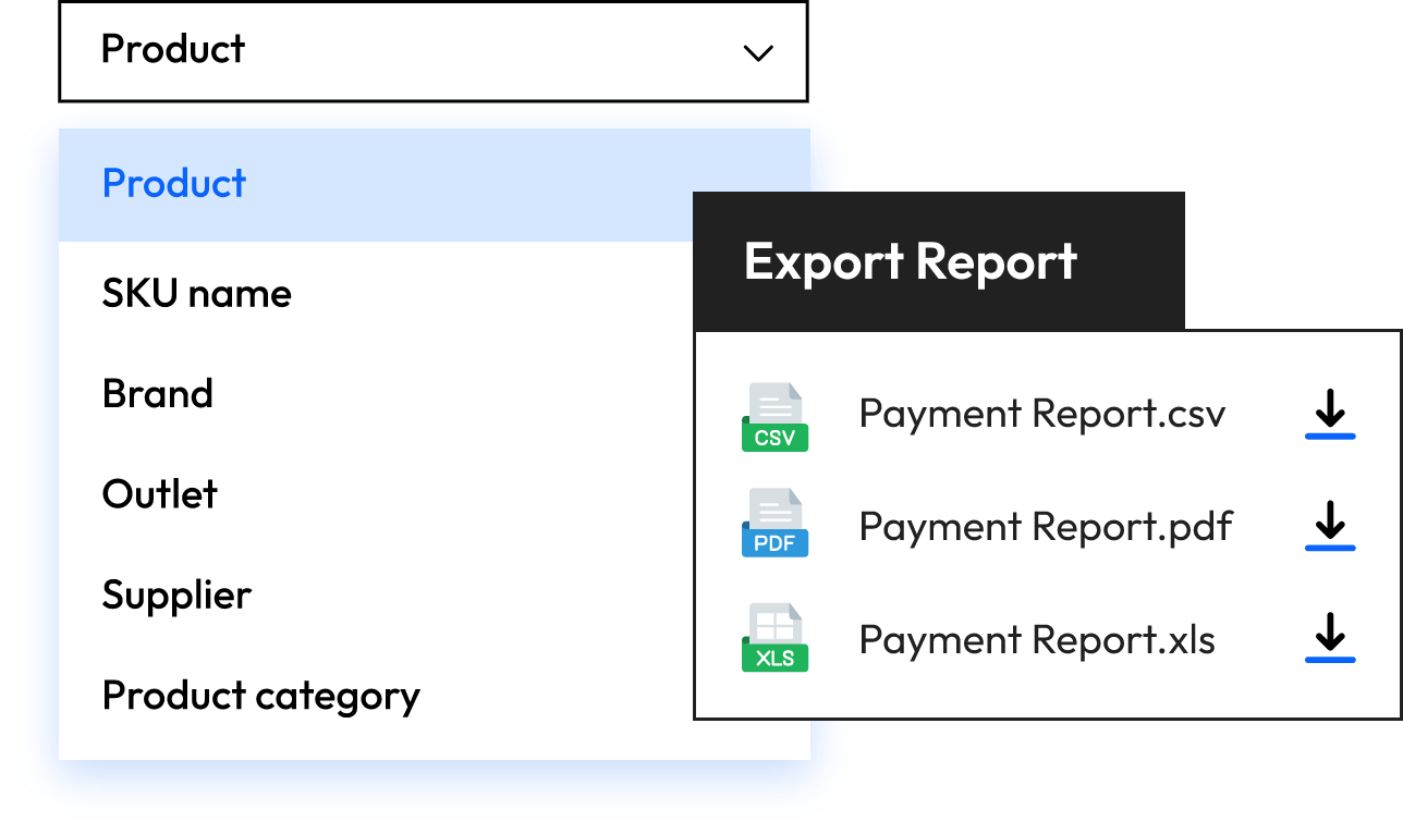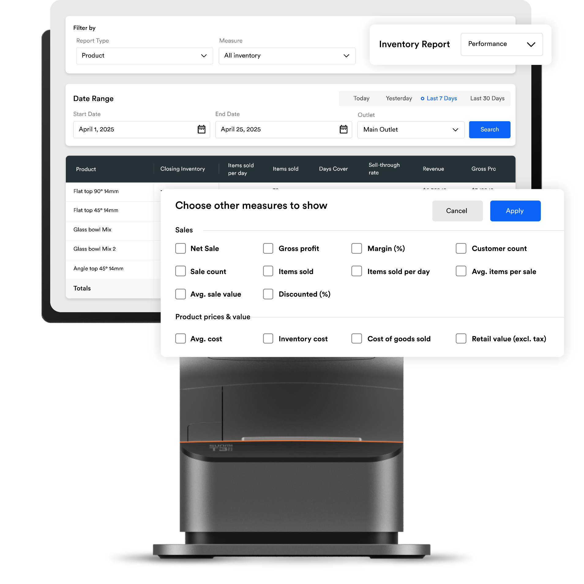 Real-time inventory: stock levels, margins, sell-through rate, and performance.