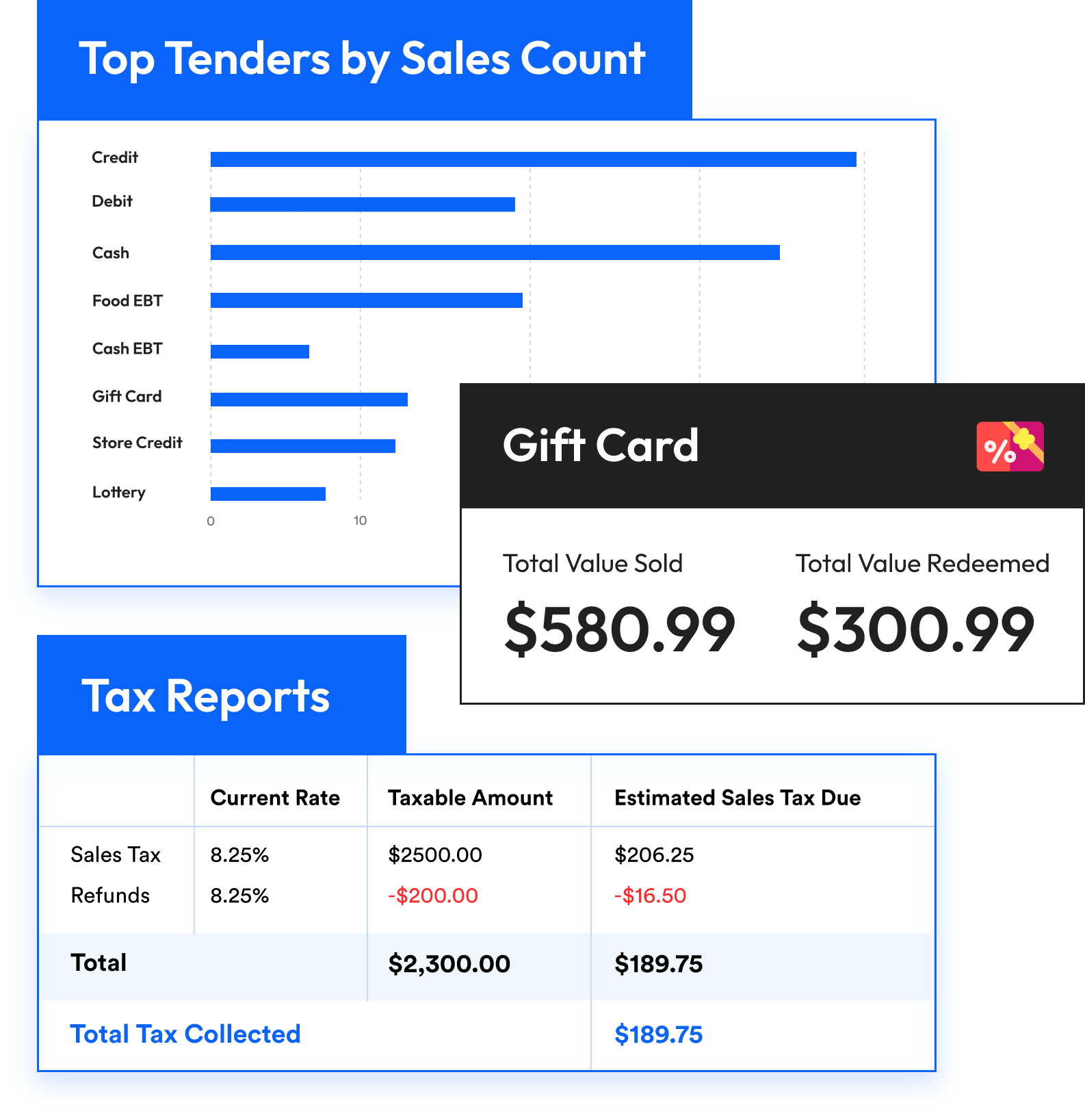 Breakdown of gross sales, net sales, discounts, loyalty redemptions, refunds, tips, and service fees.